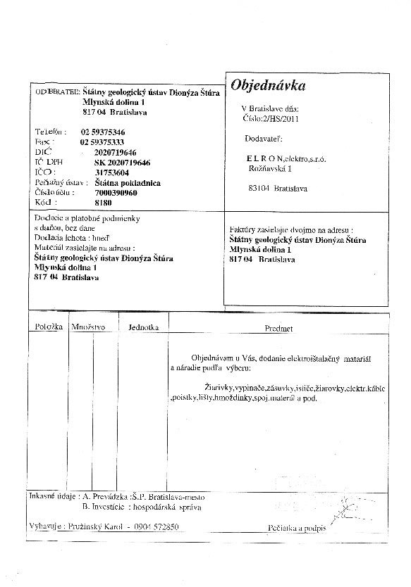| 2/HS/2011 | 3. January 2011 | ELRON, Bratislava | elektroinštalačný materiál | Zobraziť |