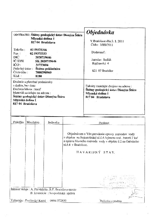 | 3/HS/2011 | 3. January 2011 | J. Sedlák, Bratislava | rozvod vody-oprava | Zobraziť |