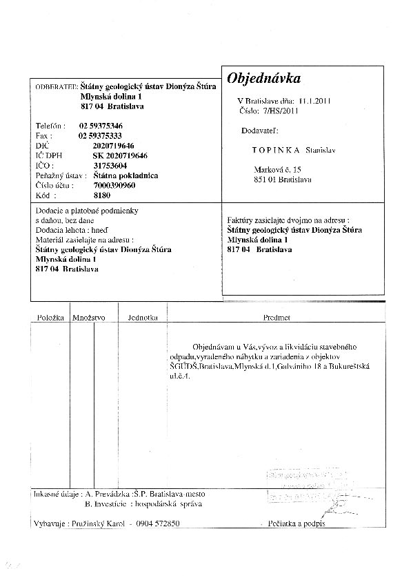 | 7/HS/2011 | 11. January 2011 | TOPINKA, Bratislava | vývoz stavebného odpadu | Zobraziť |