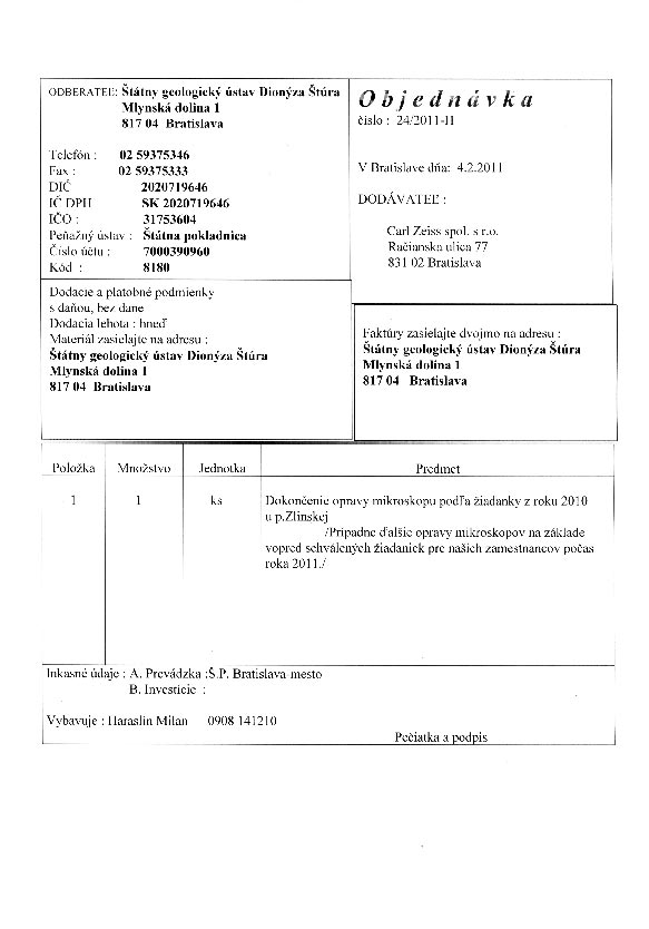 | 24/HS/2011 | 4. February 2011 | Carl Zeiss, Bratislava | opravy mikroskopov | Zobraziť |