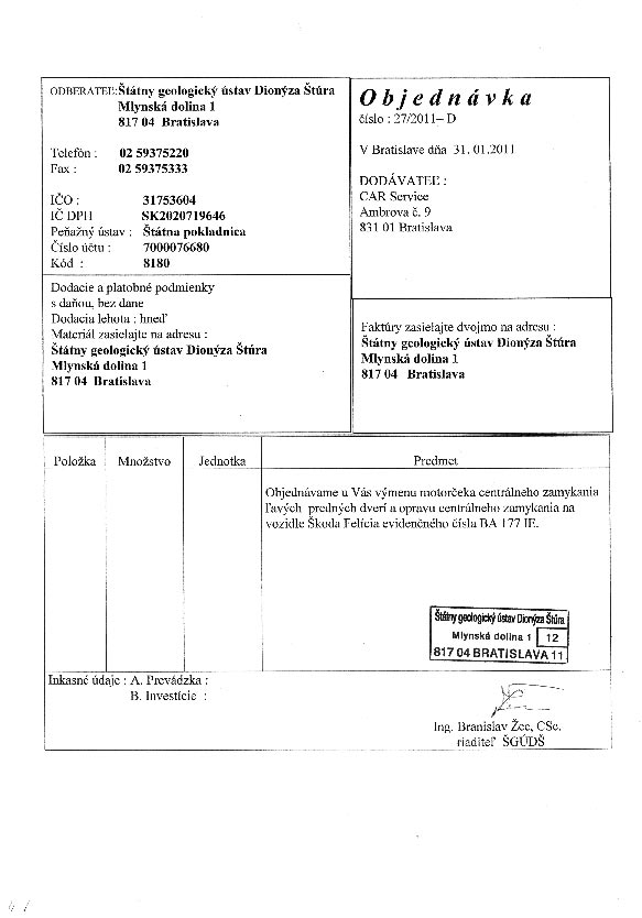 | 32/2011-D | 3. February 2011 | CAR Service, Bratislava | oprava VW Passat | Zobraziť |